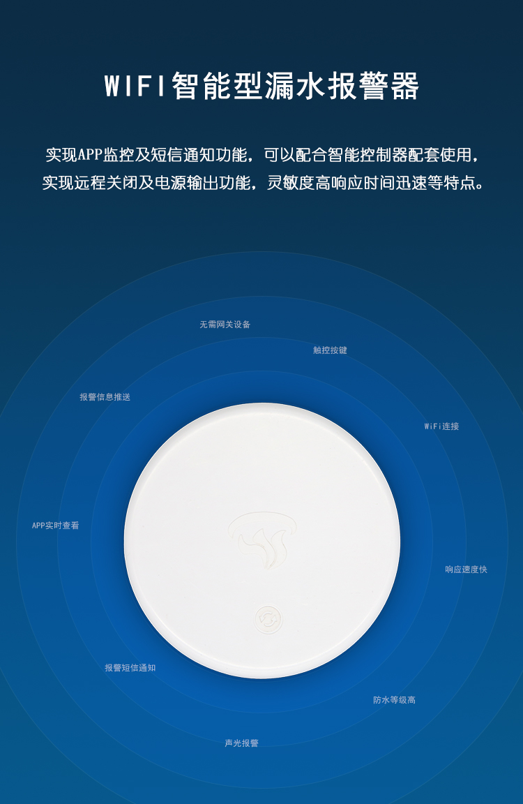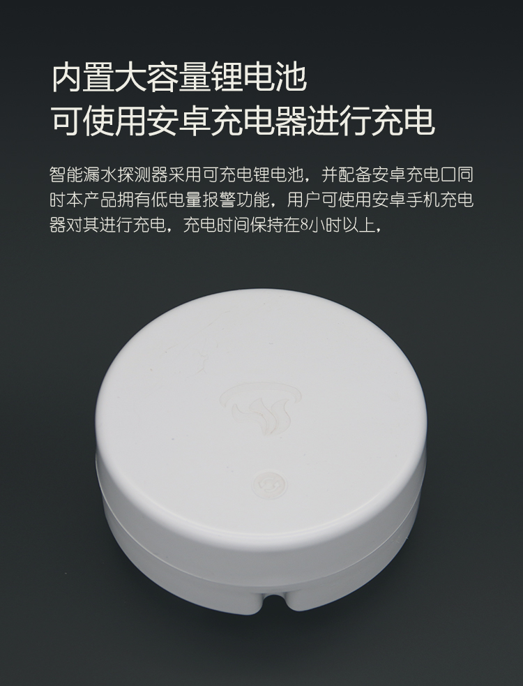 Product Description:本款WIFI型无线漏水探测报警器,防水等级达到IP67,可在5米深水下正常工作。采用家用无线网络传输方式,触控操作,可充电,可远程发送报警数据到手机APP,报警信息到手机,语音报警灯功能